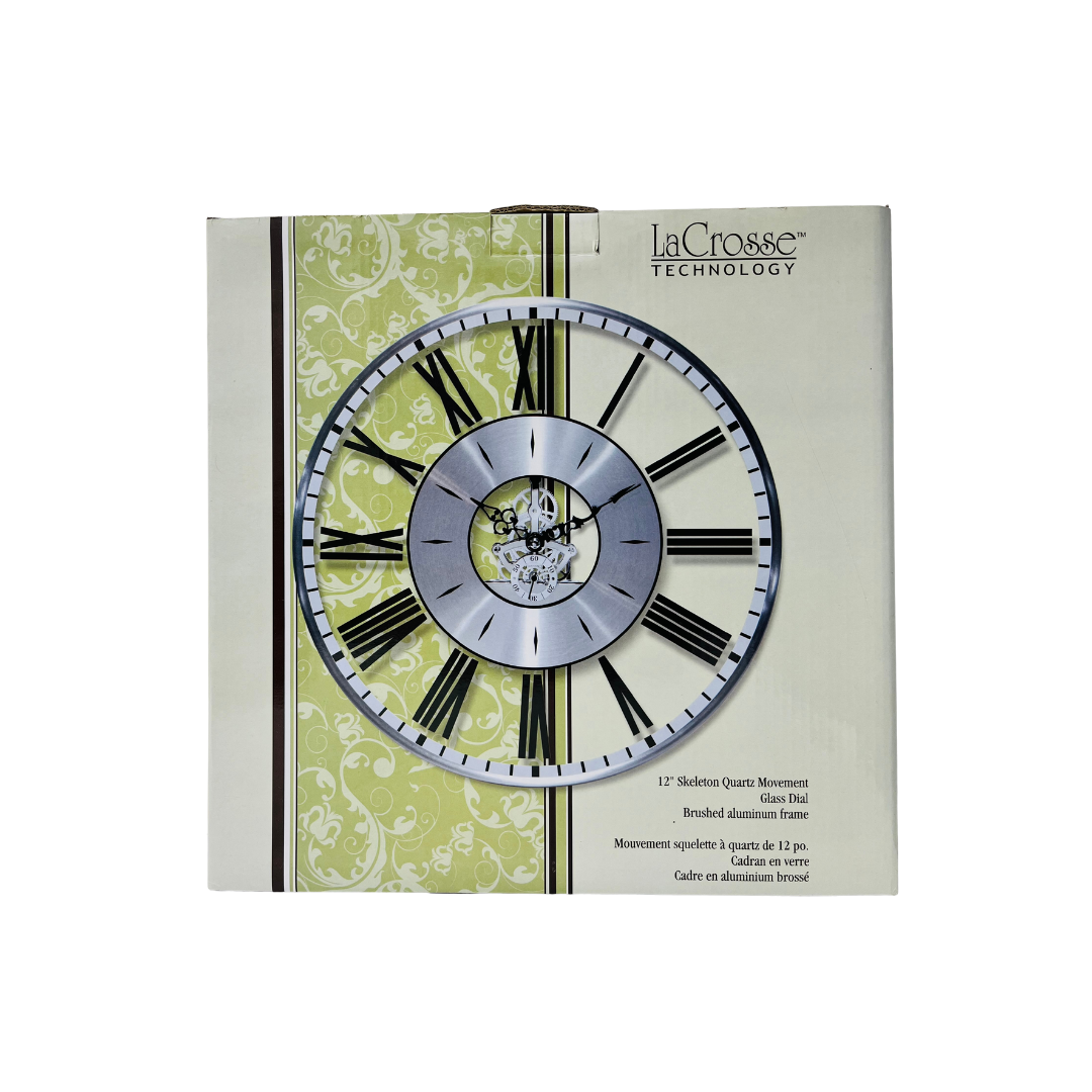 LA CROSS WALL CLOCK 12 SKELETON QUARTZ MOVEMENT GLASS DIAL BRUSHED ALUMINUM FRAME