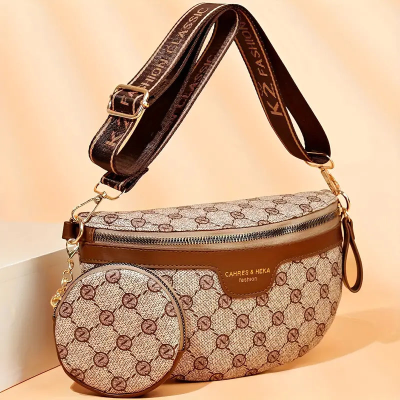 Chic Vintage Textured PU Crossbody Bag for Women - Geometric Pattern with Secure Zip & Buckle, Bonus Mini Purse